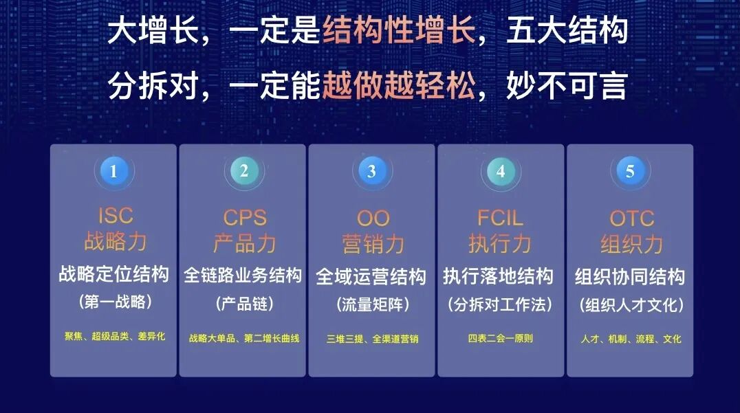 大增长,一定是结构性增长。以五力模型形成系统合力:战略力定方向,产品力筑根基,营销力抓机会,执行力保落地,组织力促循环。五力模型,让增长越做越轻松。
