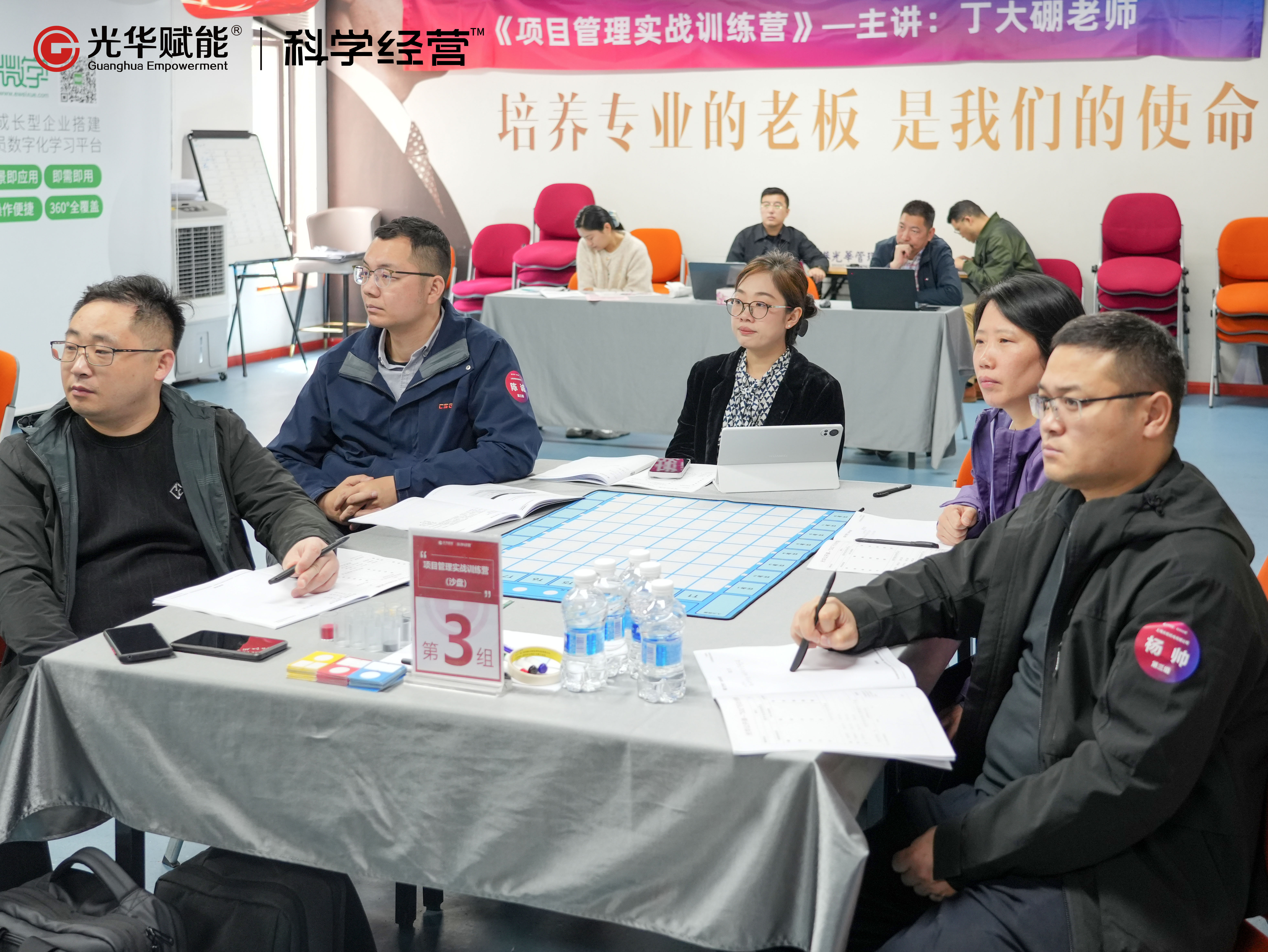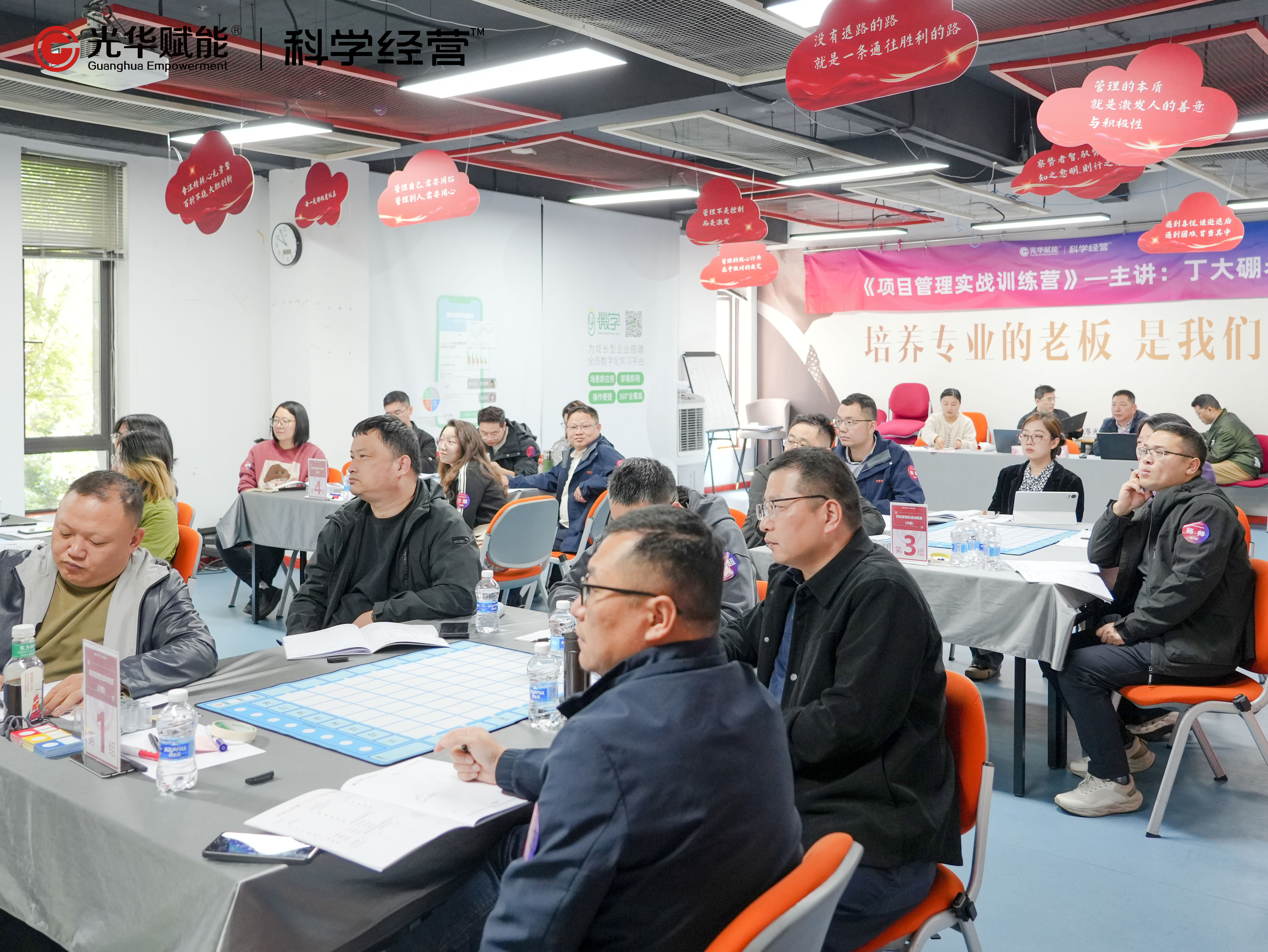 4月24日-25日,光华赋能特邀丁大硼老师分享《项目管理实战训练营(沙盘)》精品公开课。两天时间,各项目组在模拟的商业环境中,经历了项目启动、规划、执行、监控到收尾的全流程。从最初对“微权力下如何推进项目”的困惑,到最终能从容进行工期压缩、资源优化、风险应对——这不是一次传统的听课式培训,而是一场让项目管理能力在实战中“长”出来的沙盘演练。